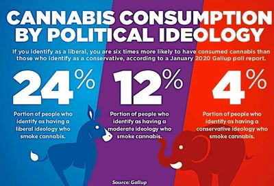 Americans who are politically liberal are six times more likely to smoke marijuana compared to those who identify as conservative. Twenty-four percent of liberals smoke cannabis, compared to 4 percent of conservatives and 12 percent of moderates.